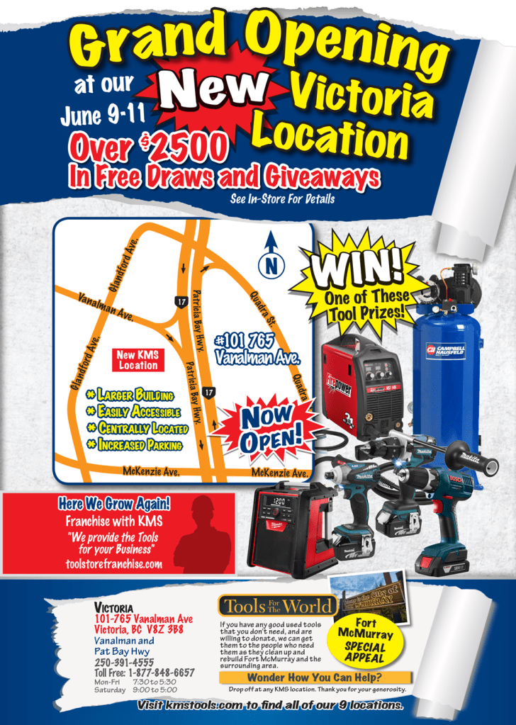 Our Grand opening is on now! June 9-11. Our new, bigger, brighter Victoria location is open for business and is celebrating during our grand opening June 9-11. Come find our new store at #101- 765 Vanalman Ave. Victoria BC.  More space means more inventory, more displays, and more parking! With over $2500 in free draws, factory reps attending, free smokies and pop and a mini show & shine on Saturday, you don’t want to miss it! Don’t forget Dad, June is “Dad’s Month” at KMS Tools! Take advantage of great specials on tools that Dad will love! Check our full color 48 page flyer loaded with great deals on tools and equipment.  You`ll find excellent prices in every department! Power Tools, Hand Tools, Woodworking, metalworking, welding, compressors and more. Plus, extra discounts from June 9th to 18th during our once a year 10-Day Sale. Not sure what Dad wants for Father’s day? Don’t forget, we have KMS gift cards available in-store & online! Come and join us and celebrate Dad all June long at KMS Tools and don’t miss the Grand Opening festivities from June 9-11th in Victoria.